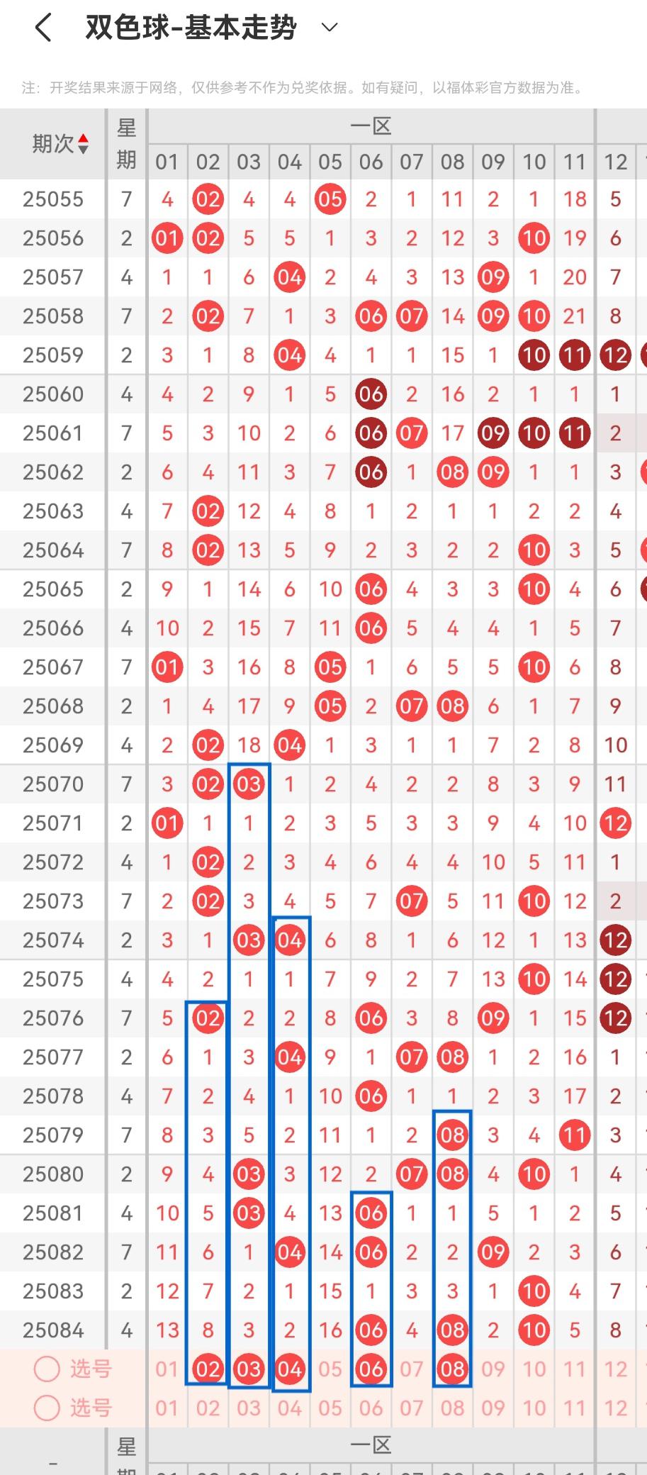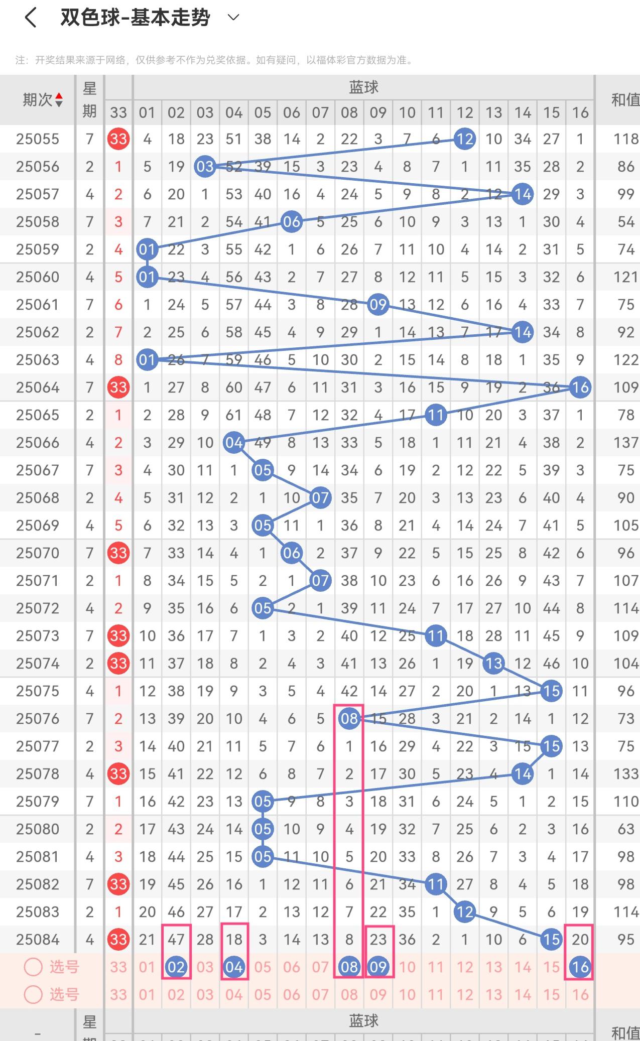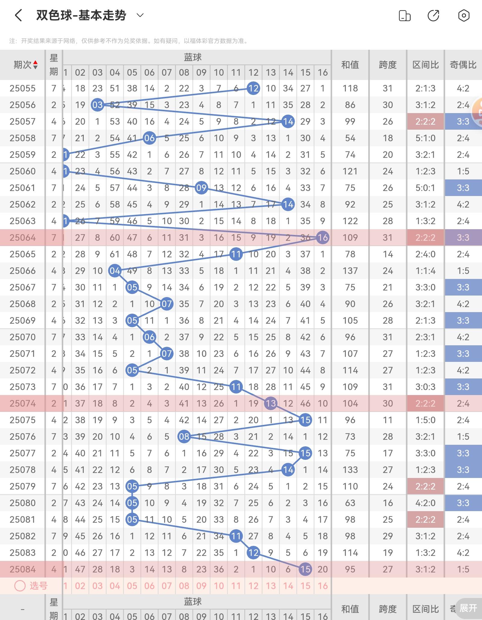 >蓝球上期(25084期)开出了15,开出了奇数号码,本期需要注意是会继续开出奇数号码还是会回补开出偶数号码,且连续三期开出了后端大号号码,本期需要注意是会继续开出后端大号号码还是会回补开出前端小号号码,本期蓝球首先需要关注的号码【02】四十七期回补号码,然后是【04】十八期回补号码,其次是【08】八期回补号码,【09】二十三期回补号码,【16】二十期回补号码,本期蓝球重点关注号码【02 04 08 09 16】