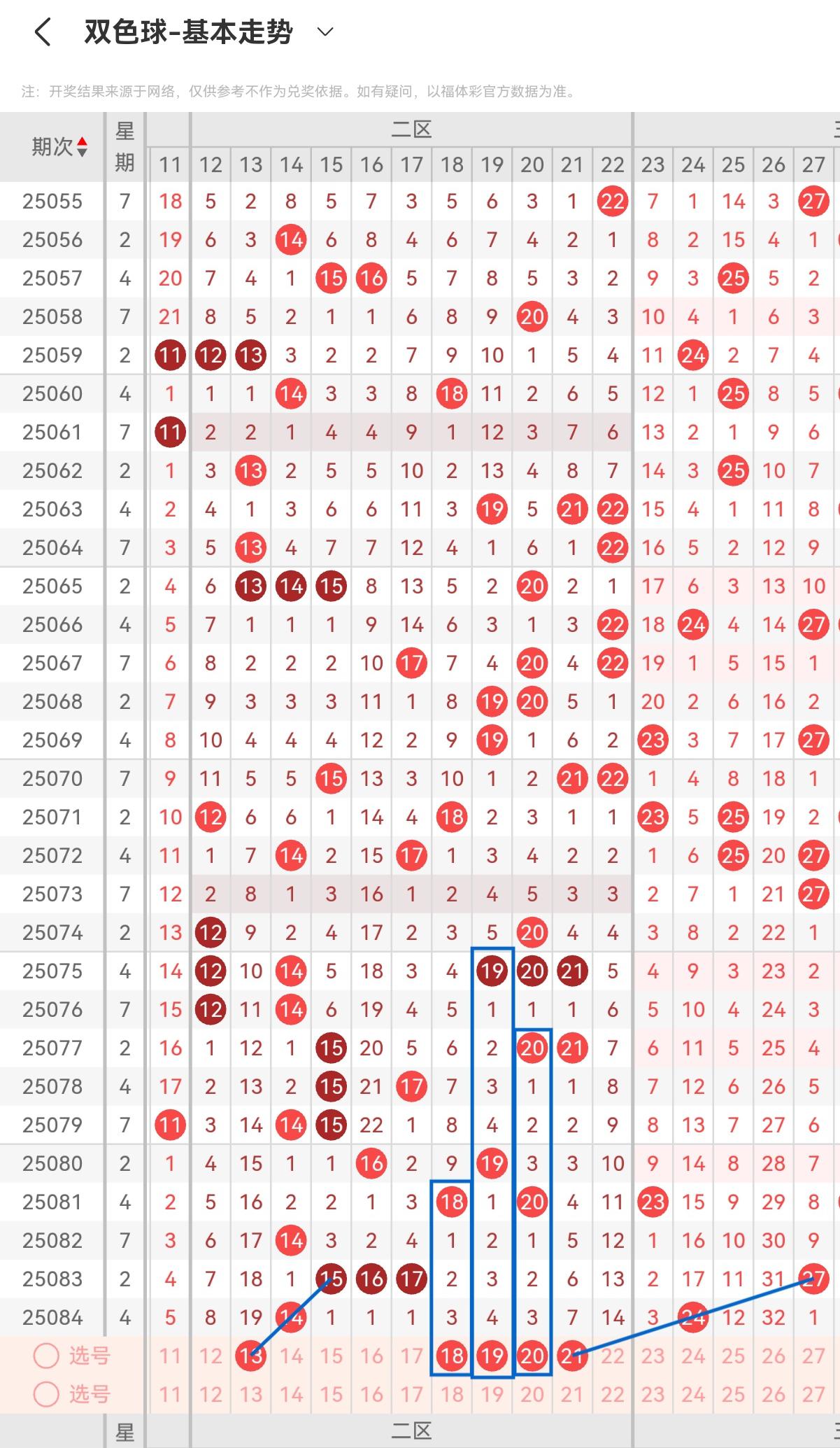 >二区间上期(25084期)开出了一码14,开出了分边号码,本期做号需要注意斜连走势号码能否开出,以及空白区域号码回补落码,从近期该区间上开出的连号分边形态来看,在25060期开出连号分边形态后下期放了空,在25071期开出连号分边形态后下期放了空,在25080期开出连号分边形态后下期放了空,本期首先需要关注的号码【13】十九期回补号码带三斜连走势,然后是【18】三期回补号码,其次是【19】四期跳空对称形态,【20】三期跳空对称形态,【21】七期回补号码带隔空斜连走势,本期重点关注号码【13 18 19 20 21】