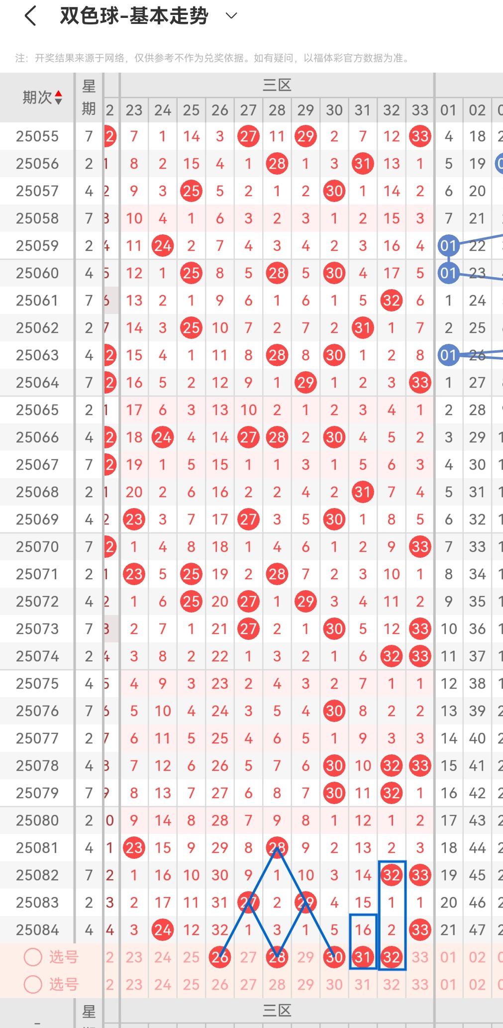 >三区间上期(25084期)开出了两码24-33,开出了独码,本期做号需要注意独码位置能否有落码,以及空白区域号码回补落码,从近期该区间上开出的独码来看,在25078期开出独码后下期独码走了重,在25081期开出独码后下期独码放了空,在25083期开出独码后下期独码放了空,本期独码位置号码需要仔细研判考虑,本首先需要注意的号码【23】三十二期回补号码带隔空斜连走势,然后是【28】三期回补号码带菱形形态,其次是【30】五期回补号码带三斜连走势,【31】十六期回补号码,【32】两期回补号码,本期重点关注号码【26 28 30 31 32】