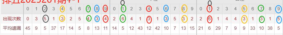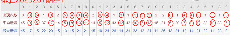 下图所圈出的为近30期各位置所出现的热码出现次数及平均遗漏值,用以参考和一些冷码组合选号。