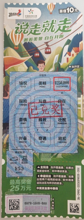 抱着闲来无事、碰碰运气的心态,张先生果断购买了4张“说走就走”即开票。当他缓缓刮开其中一张的覆盖膜时,心跳不由自主地加速——眼前的符号与中奖标识完美吻合,他竟然中得了一等奖!25万元的奖金如同天上掉下的馅饼,让原本普通的旅行瞬间变得意义非凡,直接实现了“旅行升级”。