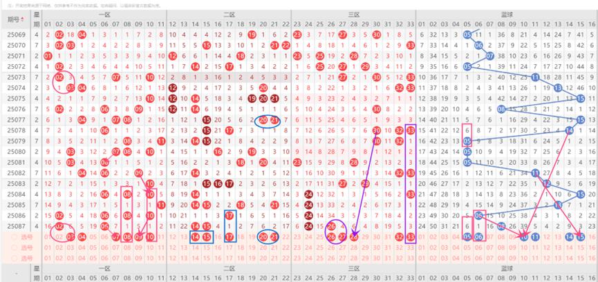 上一期三区开出了2个号码;本期三区大概率不会断区,本期三区出号数量看好1-2个;本期三区需要关注的号码:26可能会重开;27为邻号;28与24-26形成了斜连走势;32-33为近期三区出号热点号码;因此本期三区选号应该考虑26-27-28-32-33等号码。