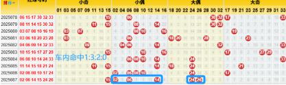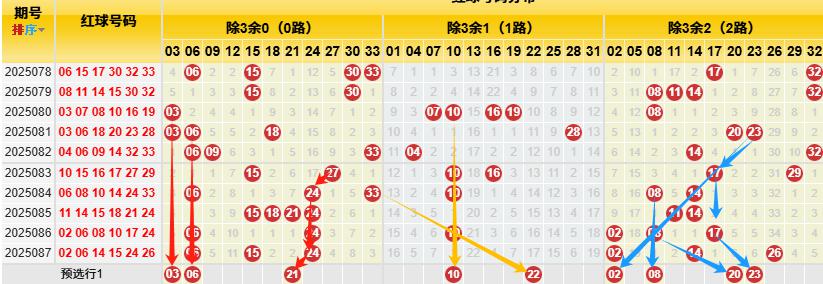 【数据参数】根据前区除3余数,组合成上图分别为余0路(简称0路)3、6、9、12、15、18、21、24、27、30、33;余1路(简称1路)1、4、7、10、13、16、19、22、25、28、31; 余2路(简称2路)2、5、8、11、14、17、20、23、26、29、32。
