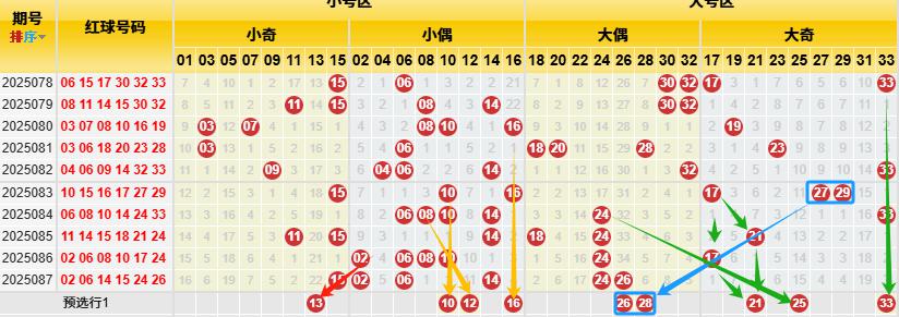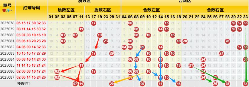【数据参数】根据前区质合小大属性,组合成上图质数区1、2、3、5、7、11、13、17、19、23、29、31和合数区4、6、8、9、10、12、14、15、16、18、20、21、22、24、25、26、27、28、30、32、33,质数区分为质数左区1、2、3、5、7、11和质数右区13、17、19、23、29、31;合数区分为合数左区4、6、8、9、10、12、14、15、16、18)和合数右区20、21、22、24、25、26、27、28、30、32、33。