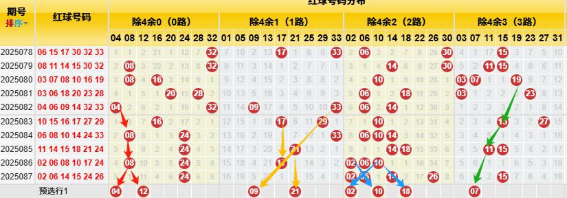 【数据参数】根据前区除4余数,组合成上图分别为余0路(简称0路)4、8、12、16、20、24、28、32);余1路(简称1路)1、5、9、13、17、21、25、29、33;余2路(简称2路)2、6、10、14、18、22、26、30;余3路(简称3路)3、7、11、15、19、23、27、31。
