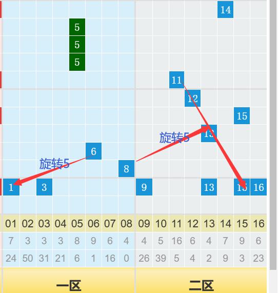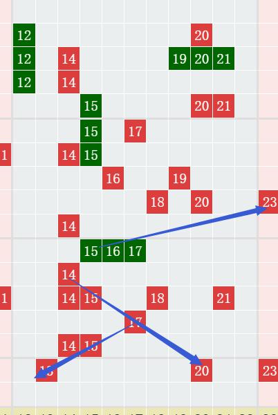 接下来我们看一下二分区,二分区12~22之间的号码,上一期开出了一个14、15的连号。那么本期的话,我们主要关注这个13号是一个冷号,同时13号也是一个13、15、17的斜联号码。那么再通过这个13进行旋转。再把这个13旋转到20。所以说20的话也是有开处可能的,同时14.17.20构成隔期斜连