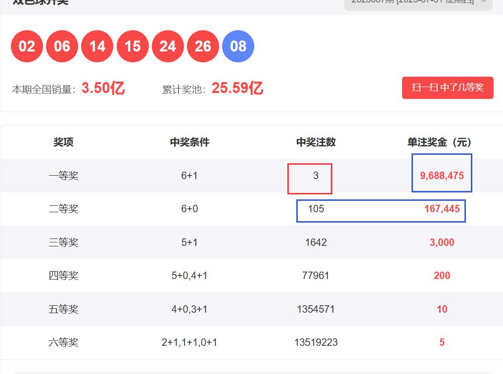 大家好,今天是2025年8月3日,星期日,今天是双色球2025088期开奖,那么首先我们回顾一下087期双色球一等奖,全国开出3注,单注奖金968万。二等奖开出105注,单注奖金16.7万