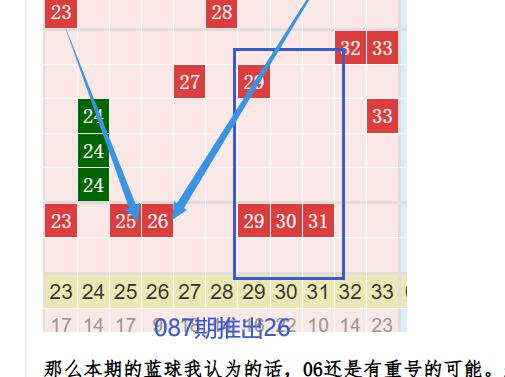 这是整个红球和蓝球的一个整体的分析,那么088期号码的走势。有明显的地方,也有不明显的地方。对于组合来说还是非常的有难度的,那么小号我们主要是关注1.2.3.4这里,然后中区我们主要的是关注13~20这个区间是有组合的。那么后面大号我们还是要强调2426可能会有重号,然后我们再根据2426的重去组合,适当的加一些间隔10期左右的号码分别是30.31.3还有最近的33