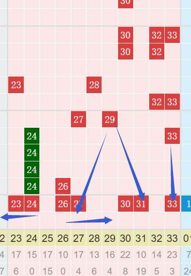 三区间23~33之间,上期开出了一个24.26一个冷热搭配的一个组合,这个2426也是一个很特殊的图形构成,大家通过走势图中可以看出,17.24.26.33形成了一个非常标准的一个等腰梯形。两边的间距分别是7,所以说上期这个2426开的是非常完美,本期088期我们重点关注。根据2426两边的边号分别是2327这个2327是要重点关注的