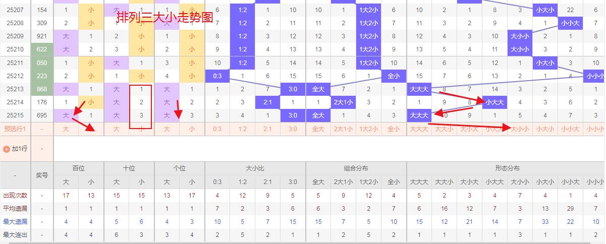 排列三 大小形态分析:从大小走势图上可以看出排列三100期内百位大小比约为51比49,十位大小比约为46:54,个位大小比约为53比47,除了十位奇数比偶数多,百位和个位是偶数比奇数多。历史数据近2期开出大大大下一期的走势为,第125期开出大大大第126期开大小小。第137期开出大大大后第138期开大大小,第141期开出大大大后142期开大小大。近期排列三大小走势呈现明显分化,热态组合"大小小"表现尤为强势,近15期内已开出6次,出现频率远超其他组合。该形态近期呈现"间隔1-2期回补"的稳定节奏,且最近3次开出后平均仅间隔1.3期,从走势规律来看,短期内极可能延续这一热态特征。而冷态组合"大大小"已持续遗漏28期,不仅突破其22期的历史平均遗漏值,更逼近34期的最大遗漏纪录,回补压力已达临界点。所以排列三第2025216期大小形态推荐大小小防大大小。本文由为彩网钱是生命动力所著,请勿转载