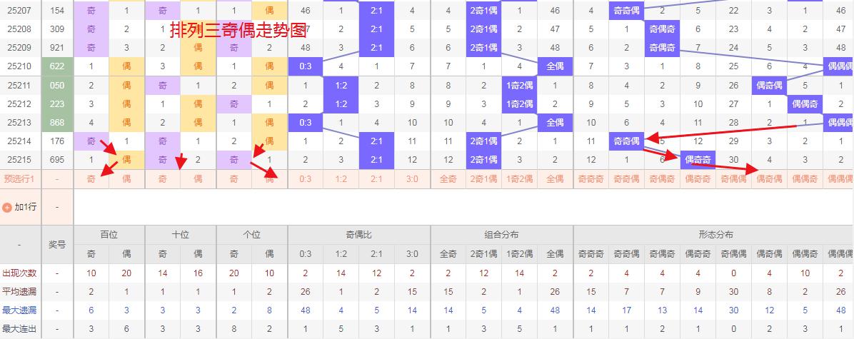 排列三 奇偶分析:从上图可以看出排列三100期内百位奇偶比约为48比52,十位奇偶比为51比49,个位奇偶比为47比53,十位的比值比较均衡,但是个位的比值偏差就有点大,历史奇偶形态近2期开出偶奇奇后下一期的走势为,第134期开出偶奇奇后136期开偶偶奇, 第145期开出偶奇奇后第146期开奇偶偶,第152期开出偶奇奇后第153期开奇奇奇。近期排列三奇偶走势呈现明显分化,热态组合"偶偶奇"、持续走强,近10期已开出4次,创下近50期出现频率新高。该组合近期呈现"开一期歇两期"的稳定节奏,且最近一次开出后仅间隔1期,短期内极可能延续这一热态规律。而冷态组合"奇偶偶"、已持续遗漏30期,远超其18期的历史平均遗漏值,回补需求极为强烈。从历史数据看,该组合最大遗漏纪录为34期,当前已逼近临界点,需高度警惕其爆发可能。采取"热冷组合"的投注策略:一方面继续跟进"偶偶奇"的热态组合,可重点关注百十位双偶+个位奇数的形态 ,所以排列三2025216期奇偶形态推偶偶奇与奇偶偶。本文由为彩网钱是生命动力所著,请勿转载