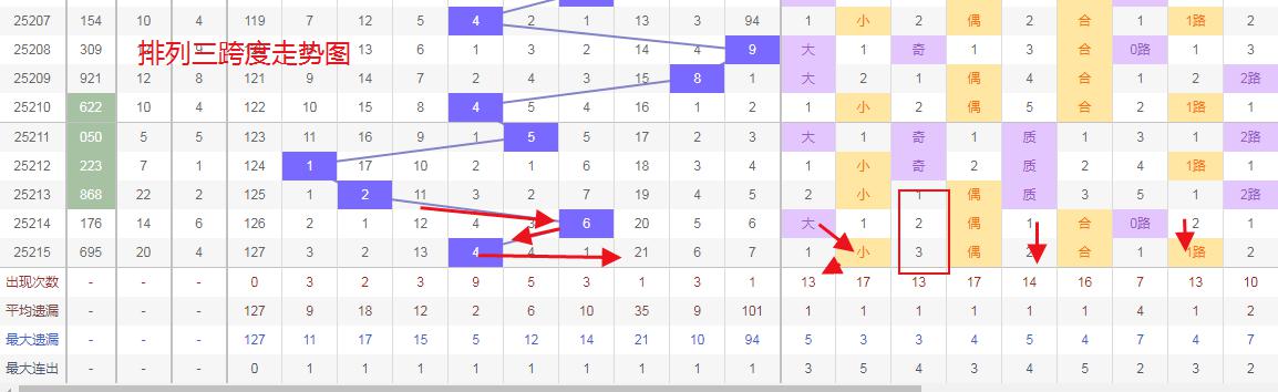排列三 跨度分析:从上图可以看出近100期的跨度大小比约为54比46,跨度奇偶比约为55比45总体来看还是比较均衡的,但跨度大小之间有点差异。我们再从历史开出4跨后下一期5跨度数据来做参考。最近10期跨度大小比约为5:5近期开出大数跨度过多返回小数跨度的概率更高一点。历史开奖近2期出4跨以后的走势为124期开出4跨后下一期走5跨走出1振幅,第134期开出4跨后下一期走8跨走出4振幅第147期开出4跨后下一期开出7跨走出3个振幅。连续多期小振幅。近期排列三跨度走势呈现明显分化,热号5跨表现尤为抢眼,不仅连续3期强势开出,更创下近30期出现频率新高,从历史数据来看,该跨度具有明显的"连开惯性",短期内仍有持续走热的潜力。而冷号7跨已持续遗漏21期,远超其12期的平均遗漏值,回补压力不断累积,需重点防范突然反弹。采取"热冷双抓"的投注策略:一方面继续跟进5跨的连开趋势,可优先考虑中段跨度组合;另一方面必须对7跨冷态保持警惕,适当配置大跨度组合。特别值得注意的是,近期奇跨占比高达70%,在防守7跨时要重点关注奇偶搭配, 综合以上分析后得出,本期预计跨度遵从历史会走出小振幅,出4跨度后容易走出1到4个跨度振幅的对称形态,跨度走出1到4个振幅看好的跨度有3578跨,所以第2025216期排列三跨度推荐3578跨。本文由为彩网钱是生命动力所著,请勿转载