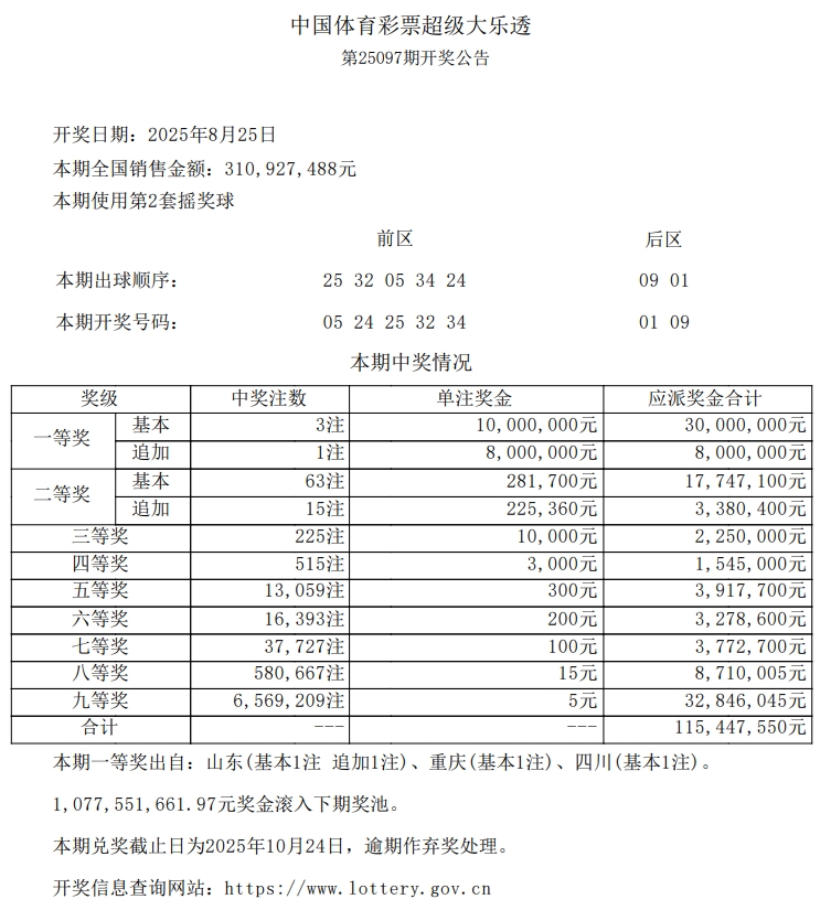 8月25日,超级大乐透第25097期开奖。前区开出号码05、24、25、32、34;后区开出号码01、09。本期全国销售3.10亿元,奖池10.77亿元。