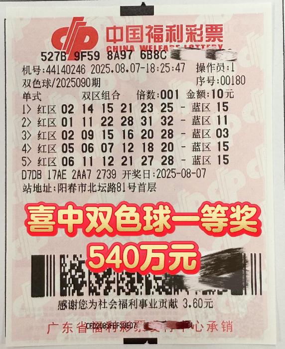 8月7日,中国福利彩票双色球第2025090期开奖结果揭晓,全国共中出一等奖51注,每注奖金540万元。其中,广东省阳春市北坛路81号的44140246福彩销售站点幸运中出一注,中奖彩票是一张10元5注的单式票。
