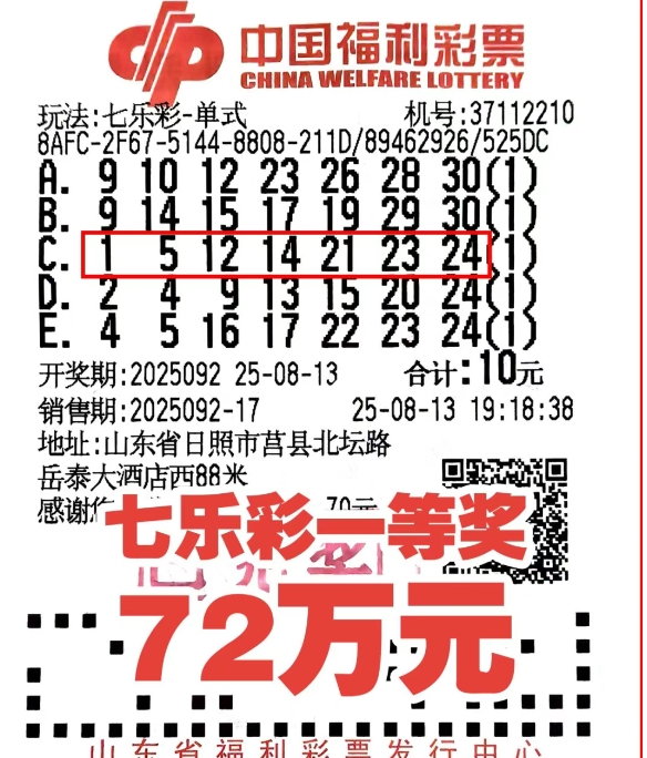 领奖了!领奖了!日照彩友获七乐彩72万元! 发表于:2025-08-26 17:59:39 浏览次数:0 8月13日,七乐彩第2025092期开奖,开出的中奖号码是01、05、12、14、21、23、24特别号码04,山东中出一等奖一注,奖金723513元,这注一等奖被日照市莒县37112210号销售场所购彩者幸运中得。 时隔12天,这位幸运的中奖者终于现身领取了属于自己的一等奖奖金723513元,中奖彩票为一张面值10元的机选单式票,让我们来一睹一等奖奖票真容。 上一篇:论佛系彩友机选中得3D单选奖的运气! 下一篇:【福彩知识知多少】福彩刮刮乐如何做到安全保密? 推荐文章