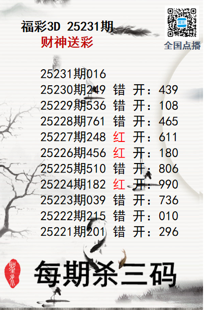 福彩3D25231期财神送彩杀三码