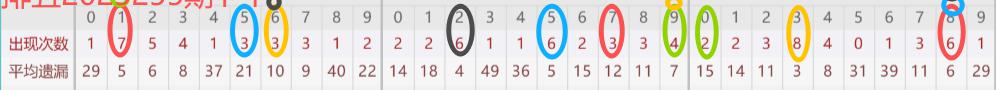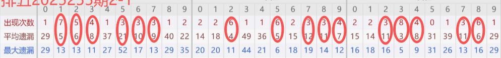 下图所圈出的为近30期各位置所出现的热码出现次数及平均遗漏值,用以参考和一些冷码组合选号。