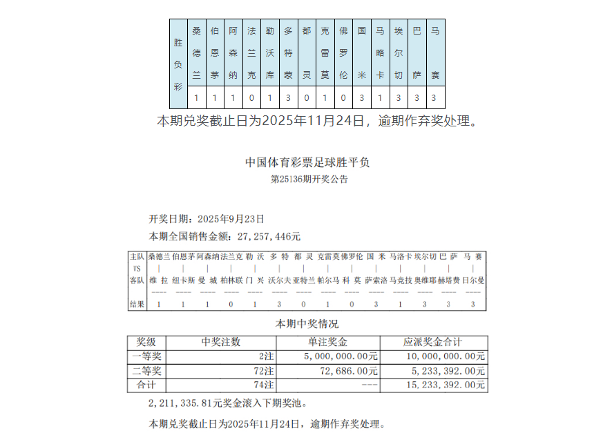 北京时间9月23日,胜负彩第25136期开奖结果揭晓。本期足彩头奖仅开出2注,单注奖金500万元,221万余元滚存至下期奖池;二等奖开出72注72,686元;任九开1031注14,252元。本期足彩销量为27,257,446元,任九投注总额为22,960,506元。