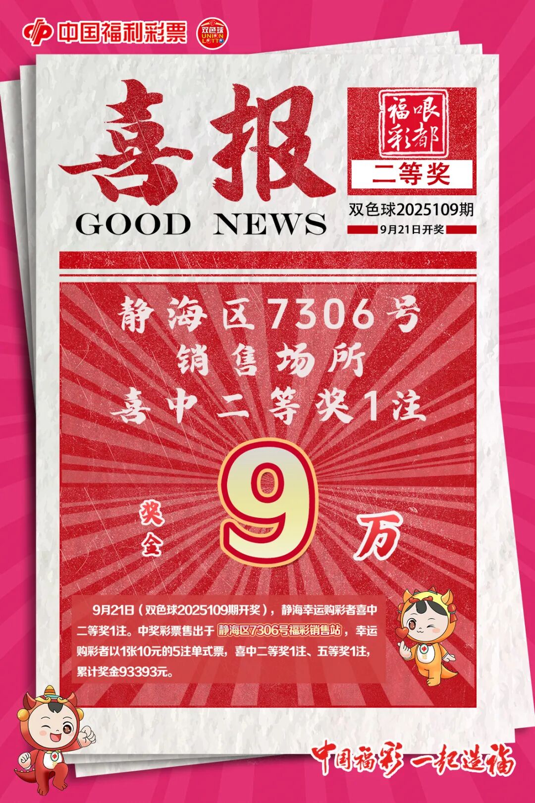 静海幸运购彩者喜中双色球二等奖9万余元