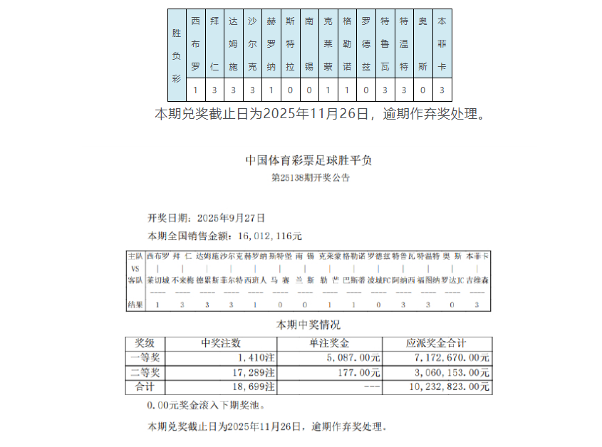 北京时间9月27日,足彩第25138期开奖结果揭晓。14场1等开出1410注,单注奖5,087元。14场2等开出17289注,单注奖金177元。任九开出78930注,单注奖金150元。本期胜负彩销量为16,012,116元,任九投注总额为18,503,722元。