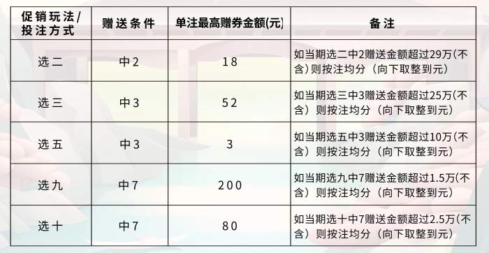 活动期内,凡在全区电脑福利彩票销售站购买快乐8游戏彩票,且中得选二中2、选三中3、选五中3、选九中7以及选十中7奖等,均可获得相应金额的电脑福利彩票赠券(详情见下表)。