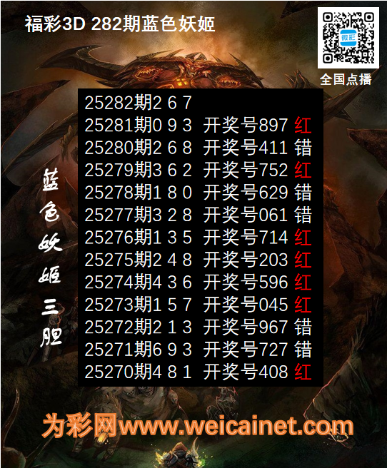 福彩3D25282期胆码 蓝色妖姬胆码图